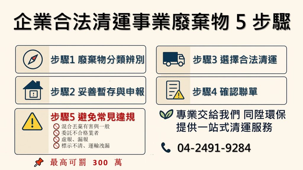 • 有害事業廢棄物清運:如廢油、重金屬污泥、化學液體、醫療廢棄物等,須委由合法清運公司處理,不能與一般垃圾清運混合。