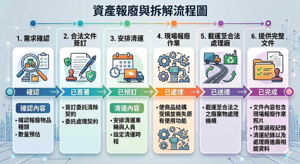 因此,建立一套完善且合法的報廢清運流程,不僅是企業落實環境責任的重要環節,也是降低營運風險、確保廢棄物妥善流向的重要措施,同時也能作為企業資產報廢與稅務申報的佐證,達到合規管理與合理節稅的目的。