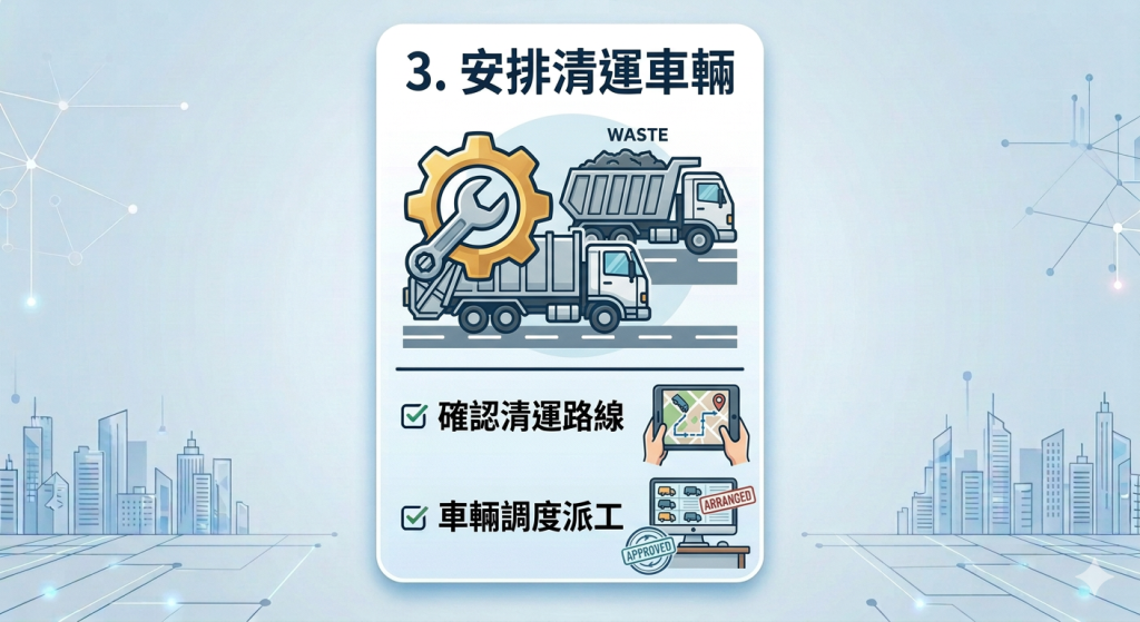 作業協調: 與客戶確認具體的進場時段與作業方式,確保現場清運動線順暢。