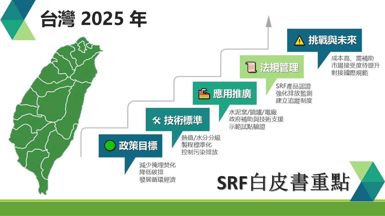 環境部在民國114年(2025年)發布的 SRF(固體再生燃料)白皮書,提升固體再生燃料的環保效益主要針對固體再生燃料的政策方向、技術發展、應用推廣及法規架構進行探討。