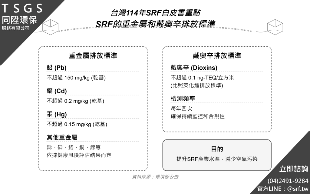 根據最新的環境部公告,固體再生燃料(SRF)的重金屬和戴奧辛排放標準已進行嚴格的調整與規範,目的在於提升廢棄物處理公司的環保作業標準,強化廢棄物清運與再利用的安全性。以下為具體標準內容: