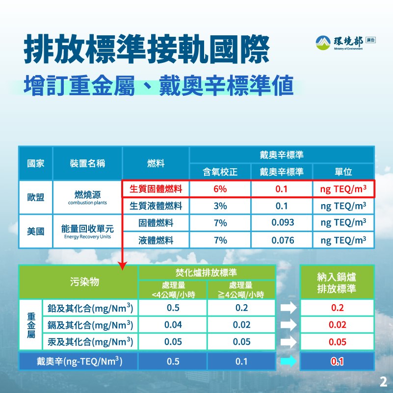 戴奧辛(Dioxins):每立方米排放不得超過0.1 ng-TEQ(毒性當量),與焚化爐標準一致